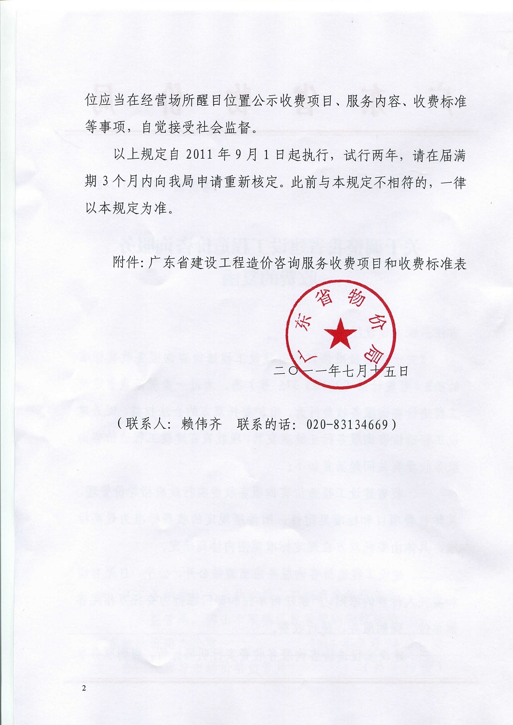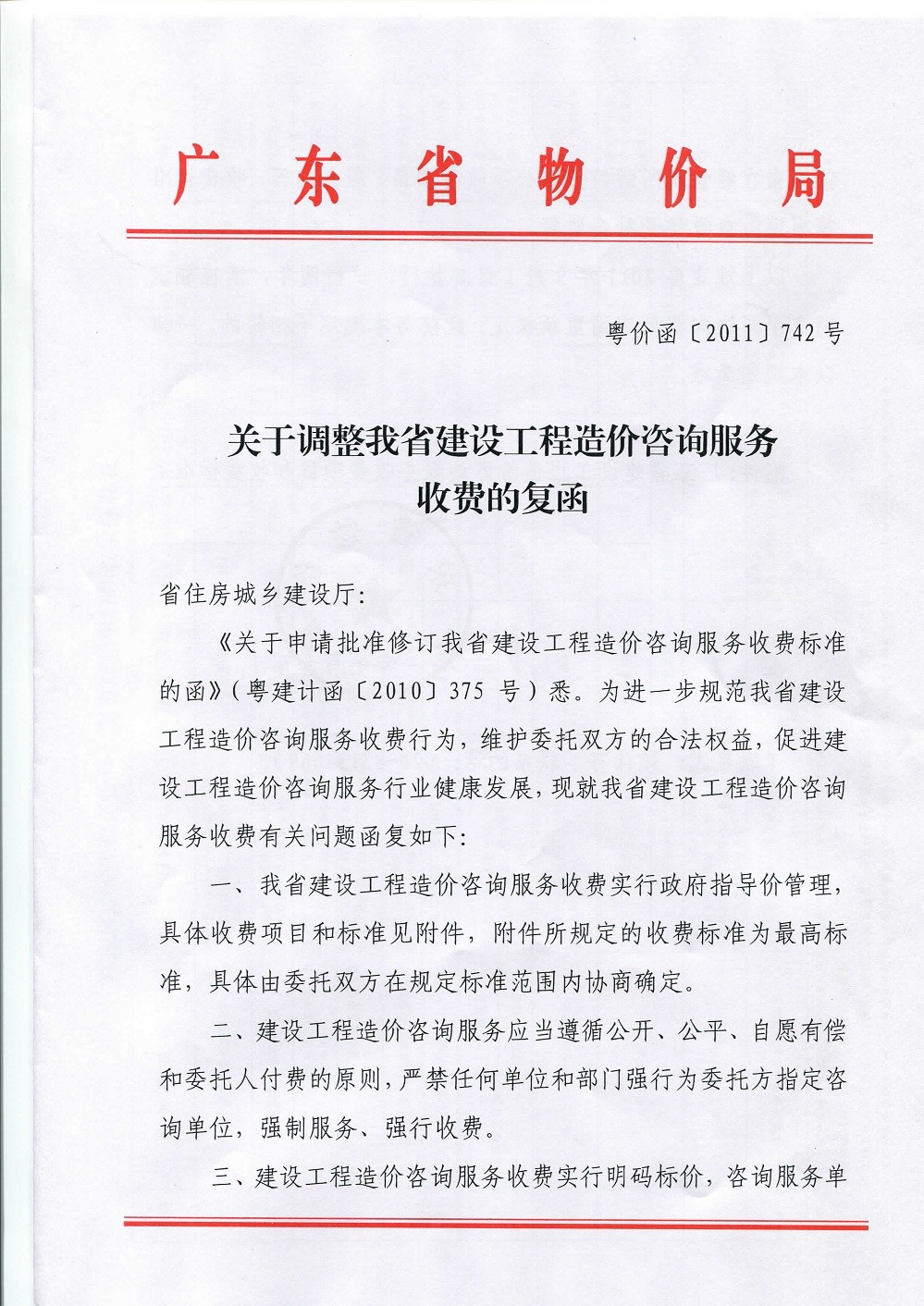广东省物价局关于调整我省建设工程造价咨询服务收费的复函 粤价函〔2011〕742号