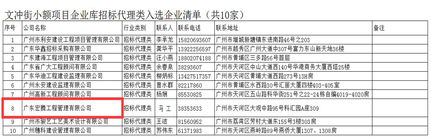 附件:文冲街道办事处小额建设工程招标代理企业库入库企业公示名单